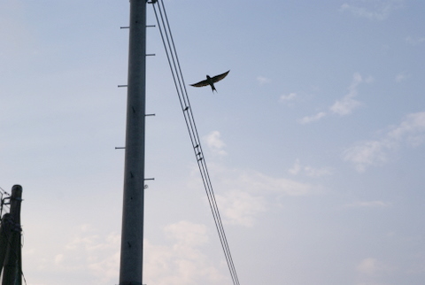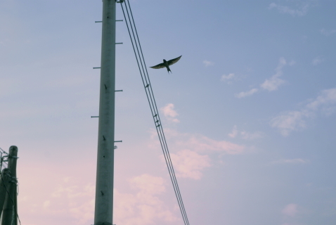 で、早速、この前撮ったツバメさんの写真で復習。上の写真がRAW現像したものですが、下のJPEG画像をちょこっと修正したのとでは雲泥の差です。撮影したのは夕暮れ時で、雲が茜色に染まりかけていた頃です。空の雰囲気をうまく再現できました。手前の電信柱も見た目に近い明るさです。