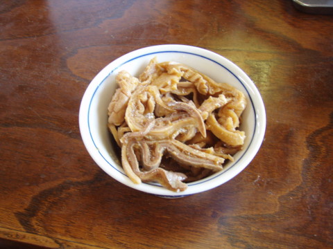 鈴木屋のモツニンです(左の写真)。モツをニンニク醤油に漬け込んであり、もうニンニクが強烈です。これを醤油ラーメンにぶっ掛けて食べると、スタミナ満点で塩分もいっぱい摂れるし、夏場のポタには最高です。でも、考えてみると、何も前日の酒で胃腸がグロッキー気味の日に食べることはなかったですね。