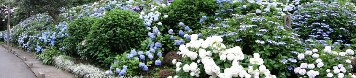 この日のポタの最後は、アジサイ通りです。今を盛りに咲き誇るアジサイたちを、パノラマ写真で撮ってみました。うーん、やはりパノラマ写真は難しいです。