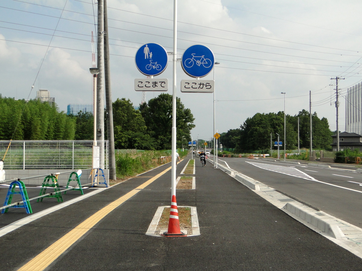 おそらく、これは「ここまでは人と自転車の共用道路、そして、ここからが右側の道は自転車専用道路」という意味でしょうね。そして、この道路は今のところ20〜30mしかありません。うーん、謎の道ですね(笑)