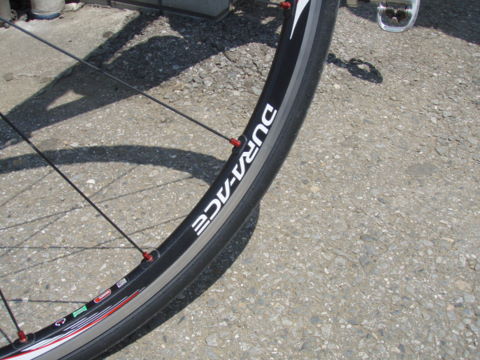 DSC00862 シマノのチューブレスタイヤ対応のDURA-ACEホイールですか。うーん、欲しい! 以前まっちさんが購入された時に見せてもらって、プチ物欲が生じたのですが、やはり見るのと、乗るのとでは違いますね。写真はまっちさんに見せてもらった時に撮影したものですが、DURA-ACEのロゴがまぶしいです(笑)