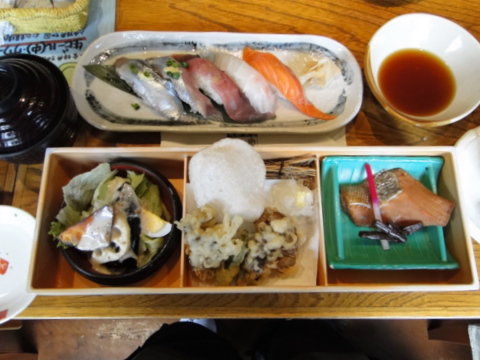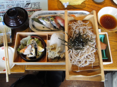 さて、お楽しみの昼食は、「楽し家」という飲み屋さんの30食限定ランチです。これはコストパフォーマンスが高いですね。天ぷらに寿司、蕎麦と御三家の揃い踏みです。次から次へと出され、蕎麦を置くところがなくなったので、積み上げました(笑)。味もなかなかで、大満足でした。