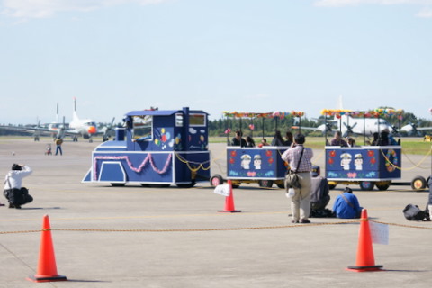 そのデカイ基地に多数の人が訪れ、滑走路に近くはごった返していました。自衛隊の皆さん(?)による出店が並び、これまた自衛隊の皆さんのバンド(?)によるステージも。そこを花電車が走り回り、完璧なお祭り状態でした。