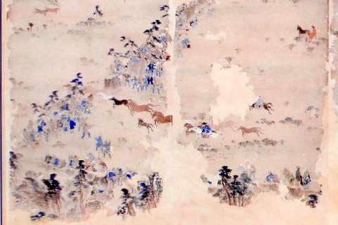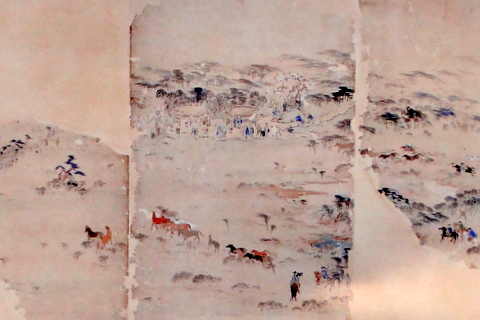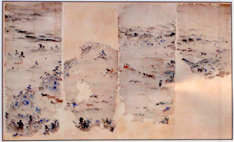 展示室内の撮影はNGとのことでしたので、上の写真はパンフレットを撮ったものです。本来は6枚から成る屏風絵だったそうですが、左の2枚は現存せず、写真にあるように残りの4枚にも欠損があります。ただ、下絵が残っているとのことで、企画展ではこの本物の絵だけでなく、下絵を基に復元した屏風も見ることができました。