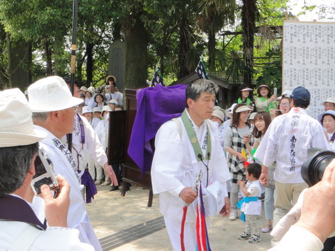 稚児行列の後は、僧侶の方々の行列が続き、最後に如意寺のご住職、そして厨子に納められた弘法大師像がやってきました。このように大師像を担いで札所を巡ることから、「送り大師」と呼ばれるとのことです。