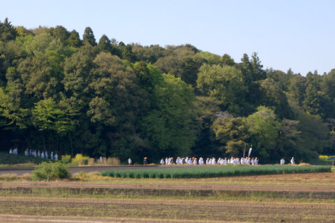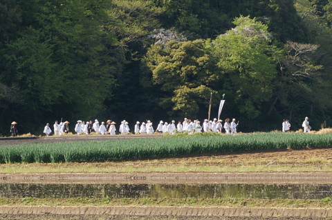 そうしたら、白装束の大集団に遭遇しました。よく見ると僧侶の方も何人かいらっしゃいます。「南無・・・」とまるで歌うかのような唱和に合わせて、皆さんがこちらへやって来られます。ひょっとして、これは・・・。