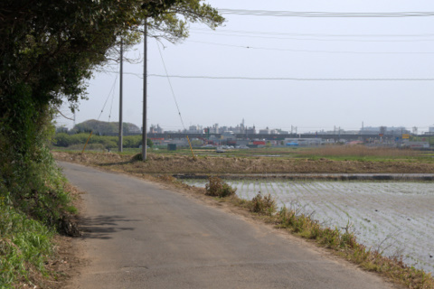 で、この辺りまで南下しました。ここから田んぼの中の道を走ると、船橋駅方面や東船橋駅方面に行けそうですが、目的地を決めておらず夕刻も近かったので、ここでUターンしました。南を眺める東船橋方面のビル群が田んぼの向こうに見えます。次回はもっと南下して市街地まで走ってみることにします。