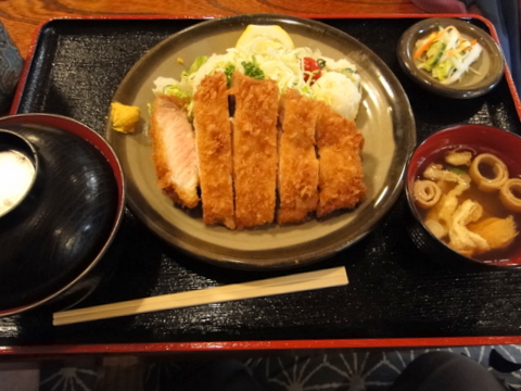で、食事は佐倉の「おかやま食堂」さんです。当然、私は知らなかったのですが、ここは自転車乗りの皆さんには有名なお店とのこと。何故かは、この見事なロースかつ定食を見れば一目瞭然です。このボリュームで930円! お肉もジューシーで大満足でした。