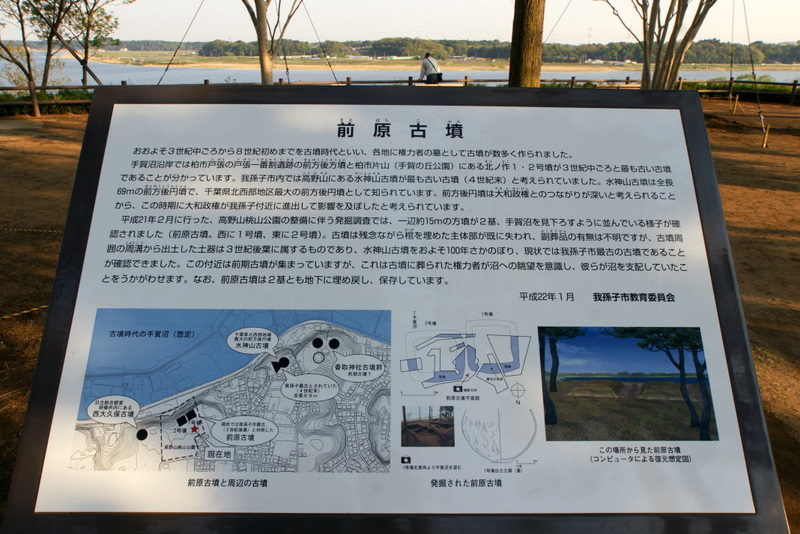 ゼロポイントの眺めもさることながら、私が食いつくのはやはりこれです(笑)。桃山公園整備のために発掘されて埋め戻された「前原古墳」は、3世紀後葉の方墳2基だそうです。手賀沼南岸の古墳と共に、東葛地域で最古に属する古墳です。