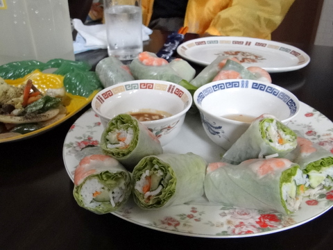 そして、料理も素晴らしかったです。生春巻き、揚げ春巻き、野菜炒め、サラダ、チャーハン、フォー(ベトナムのラーメンですね)、デザートが順次机の上に並びました。当然、すべてベトナム料理で、どれもおいしかったです。特にベトナムの醤油のニョクマムを付けていただく生春巻きと、レモンを絞って食べるフォーが最高でした。