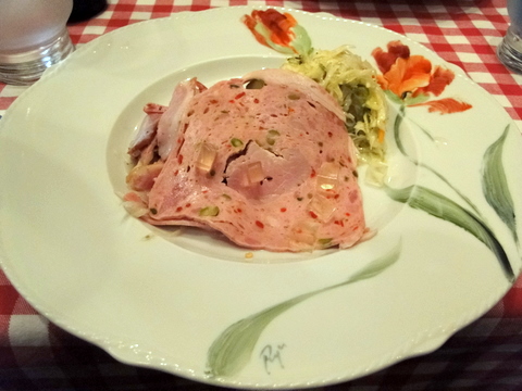 まず前菜がソーセージのマリネとザワークラフト(上の写真)。これ、すごく美味しい。特にザワークラフトの嫌味の無い酸味が最高でした。続いてスープが出て、お待ちかねのメインディッシュです。