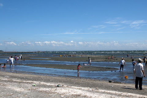 さて、三番瀬です。来てみてビックリ。こんなに多くの人が遊びに来ているのですね。今までオフシーズンにしか来たことがないので、こんなに賑わっているとは知りませんでした。ちょうど引き潮の時に来たので、沖合いまで人だかりが続いていました。
