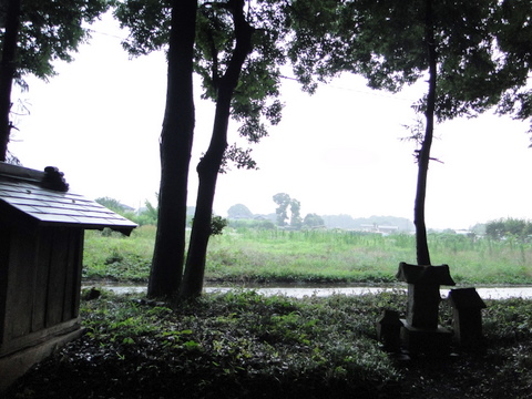 ここは元祖雨宿りの神社です(笑)。流山の上新宿になる八坂神社ですが、ここから眺める雨模様の田園風景は素晴らしいのです。この辺りを通りかかった時、ちょうどラッキー(?)なことに、また雨が降ってきました。それで、雨宿りでパチリ。やはりいいですねぇ・・・と思いたいところでしたが、蚊の大集団に襲われて難儀しました(苦笑)