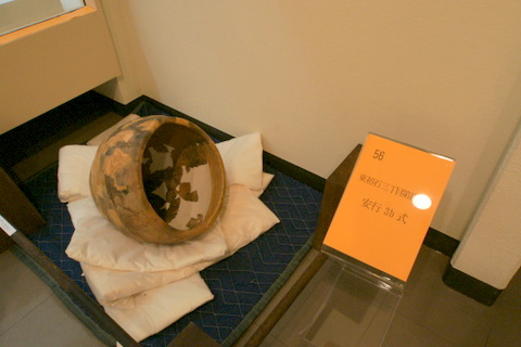 最後にスペシャルサービスがありました。なんと、この縄文土器を抱えさせてもらいました。煮炊きをした瓶とのことで、私がまず最初に抱えてさせてもらいましたが、その時「これ、ひょっとしたら遺体を埋葬した瓶かもしれませんよ」とのお言葉。もう「ゲッ!」でした(苦笑)