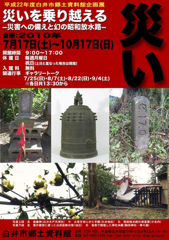 で、こんな暑い思いをして、どこへ行ったかというと、白井市郷土資料館です。この資料館では今、「災いを乗り越える−災害への備えと幻の昭和放水路−」という企画展をやっています。実は郷土資料館から、そのご案内のコメントをブログのエントリーに頂き、「幻の昭和放水路」に心惹かれ訪ねてみた次第です。