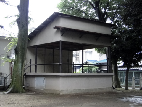 で、ふと見ると、鉄筋コンクリートでできた神楽殿があり、舞台の上にあがれるではありませんか。進退窮まっていましたので、雨宿りにお借りすることにしました。鉄筋コンクリートは無粋ですが、完璧に雨を防いでくれます。助かった。本当に助かったです。