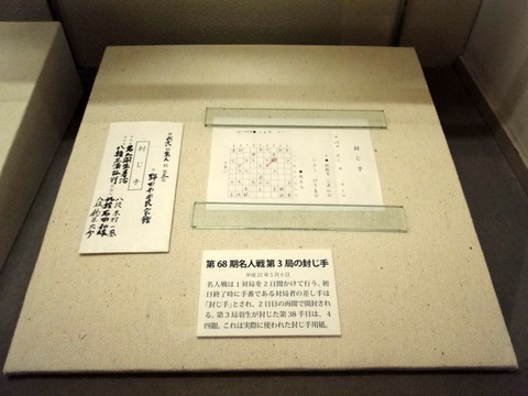 それに、今年5月に旧・茂木佐平治邸で行われた名人戦第三局で使われた将棋盤や、羽生名人の封じ手の実物も展示されていました。実は、むしろ私は、こちらの方に食い付きました(笑)。
