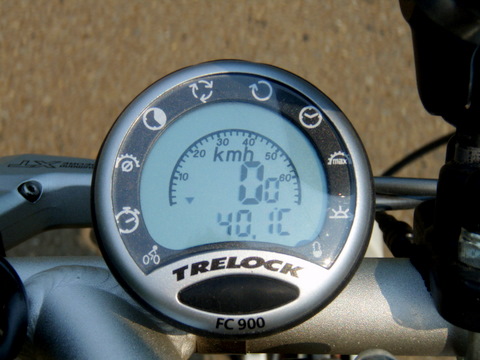 当然、もうメチャメチャ暑い。使った自転車は折り畳み自転車のPacific-18ですが、この自転車に付けているトレロックのサイクルコンピュータに温度計の機能があります。普段は利用しない機能ですが、あまりの暑さに使ってみたら、こんなの出ました。