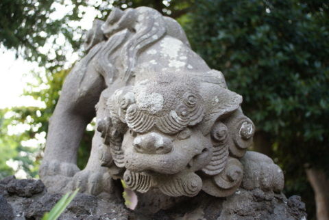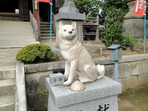 で、本堂の前に「狛犬」らしきものが。表情はかわいいのですが、どうも造形が微妙です(笑)。特に「狛犬」の前にある半球の物体は何なんでしょうね。