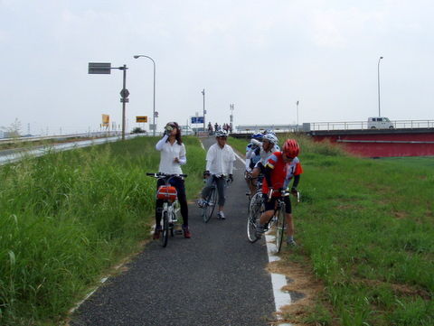 そして当日、なんと皆さんの日ごろの行いが良いのか、少し曇っているではありませんか。そして、手賀大橋下の集合場所に行ってみると、ご参加の皆さんのモチベーションが極めて高いこと! これは関宿に行くしかないということで、日陰が皆無の江戸川CRで追い風に乗り関宿城を目指すことにしました。