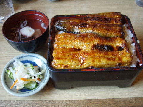 そして、随分待って出てきたのが、これです。上うな重で肝吸いが付いて1400円。大盛りはサービスだそうで、それをたのむと、お重に満杯のご飯が詰まって登場。うーむ、これは食べごたえがありますね。しかも、辛めのタレと鰻の香ばしい焼き具合が絶妙。これは素晴らしいです。