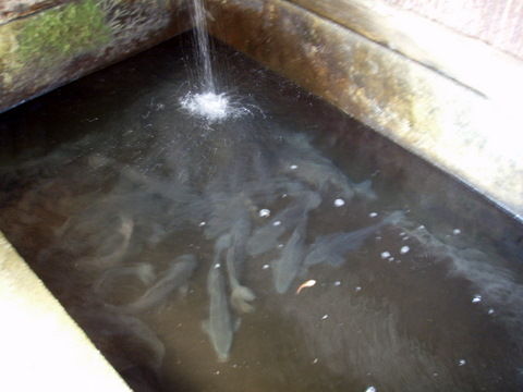 この「かどかわ」は鯉こくや鯉のあらいなど鯉料理も名物だそうです。確かに、外の小屋の生け簀の鯉は元気いっぱいでした。鯉料理の注文があったようで、店の人が鯉を捕まえに来たのですが、いったん捕まった鯉が脱走を敢行。当然、再び捕まり、どなたかの胃袋に納まったようですが、この生きの良さにはビックリしました(笑)
