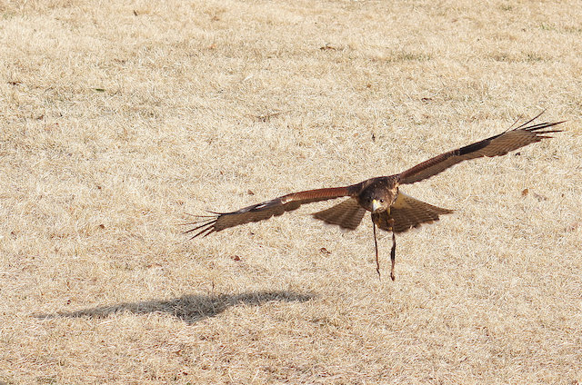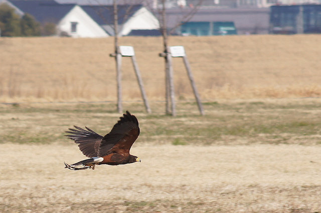 最初の2枚はハヤブサ、真ん中の2枚はオオタカ、そして最後の3枚はアメリカ大陸原産のハリスホークです。ハリスホークは鷹狩りの入門種だそうで、フライトフェスタでも参加猛禽類中ダントツの多数派でした。それにしても晴天だと、結構見栄えのする写真が撮れますね(喜)。よろしければ、これらのサムネールをクリックして、より鮮明な写真をご覧ください。