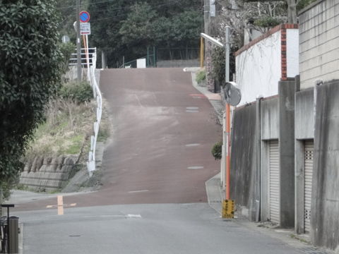 住宅街になっており面白みは無く、途中で疲れている時は壁のように見える、写真のような急坂があるのが難点ですが、自動車に追われることも無くストレスフリーで走れます。私と同じく自動車との並走が苦手な方は是非どうぞ。