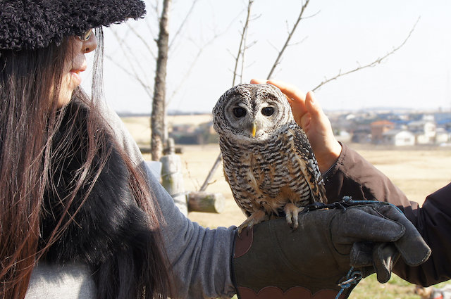 競技に参加した鳥だけでなく、会場にはいろんな猛禽類がいました。その中で、最も精悍な奴と最も可愛い子です。上の写真はイヌワシ、下の写真は何とかフクロウ(名前を聞いたけど忘れました)です。このフクロウは、呑さんがなでると愛くるしい表情を浮かべるのですが、私がなでると逃げました。どうも、猛禽類を始めてなでる私の緊張感が、この子に伝わってしまったようです(苦笑)