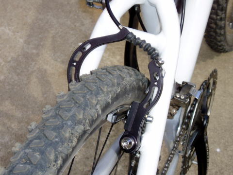 実は、リアにはVブレーキブースター(このパーツはもはや化石ですね)を取り付けていたので、普通のVブレーキであろうと、Direct Curve 5であろうと、ほとんど見た目に変化がありません。ちなみに上の写真がVブレーキ、下がDirect Curve 5です。
