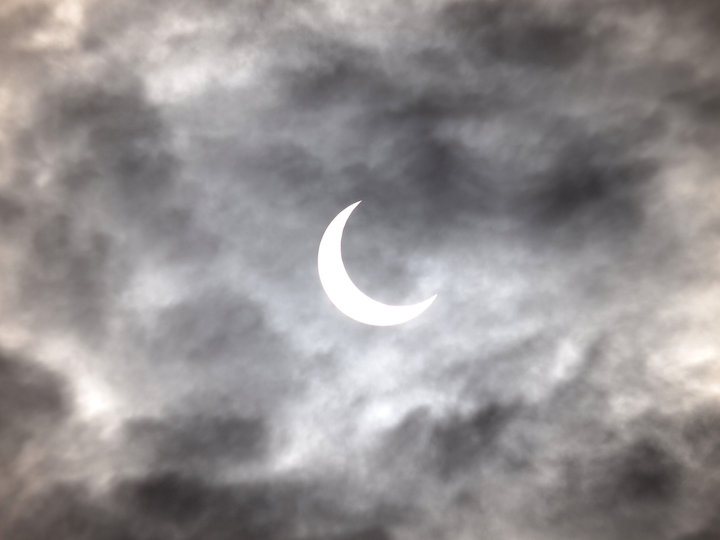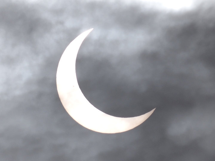 ところが、どんどん雲が多くなってきました。欠けた太陽は見えるのですが、光量を10万分の1に減光するフィルターを通すと、雲を通した太陽は暗すぎて、ほとんど写りません。