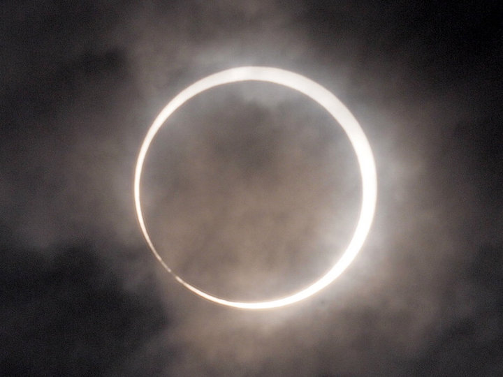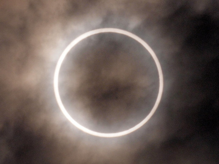 雲は多かったのですが、今思えば金環食がより趣のあるものになりました。晴天だと日食グラスやカメラを通して、単に光のリングが見えるだけですが、今回は雲がちょうどよい近景になり、味わい深い情景となりました。