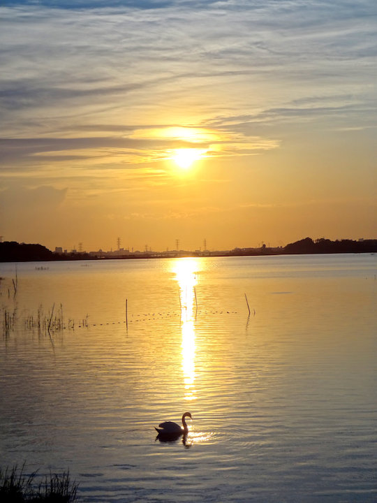 さて、連休中のポタ納めは、昨日でした。素晴らしい天気でしたので、茨城方面をロードレーサーで走ってきました。この写真は手賀沼に戻ってきたときに撮ったものですが、コブハクチョウがうまく夕日の光柱の先にやって来てくれました。