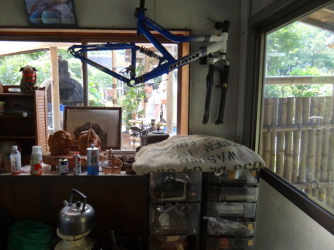 食事の後は探検です(笑)。この店のご主人は自転車好きとのことで、店内にはピストバイクが鎮座していました。離れ(物置?)にはマウンテンバイクのフレームや各種パーツ、工具が・・・この店、自転車乗りのたまり場になるような予感がします。