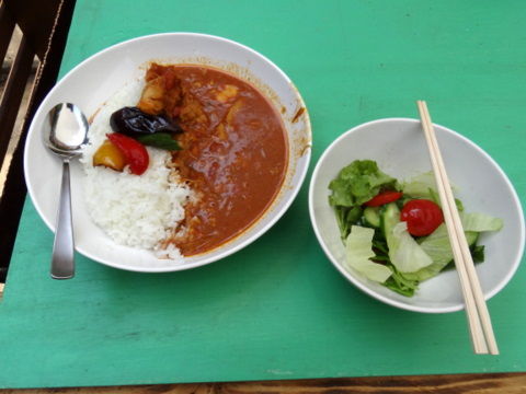 お楽しみのカレーとアイスコーヒーです。意地きたなくサラダを先に少し食べてしまった後で撮影しましたので、サラダ、本当はもっとあります(苦笑)。カレーはスパイシーで美味い! 辛いものって、食べていると元気が出てきますね。大盛りでしたので量も大満足でした。