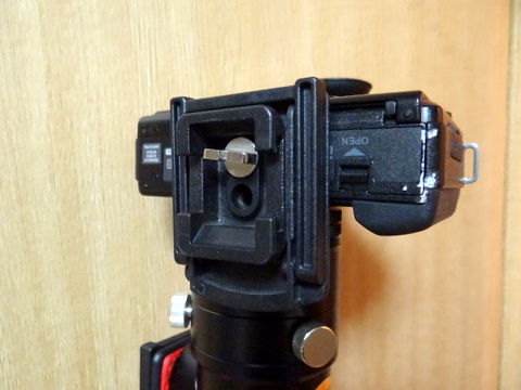落下の原因は、このネジが緩んだことです。ガンマンスタイルのカメラホルダーB-gripは、カメラに取り付けた、このクイックリリースをB-grip本体にはめ込むことで、カメラを装着します。