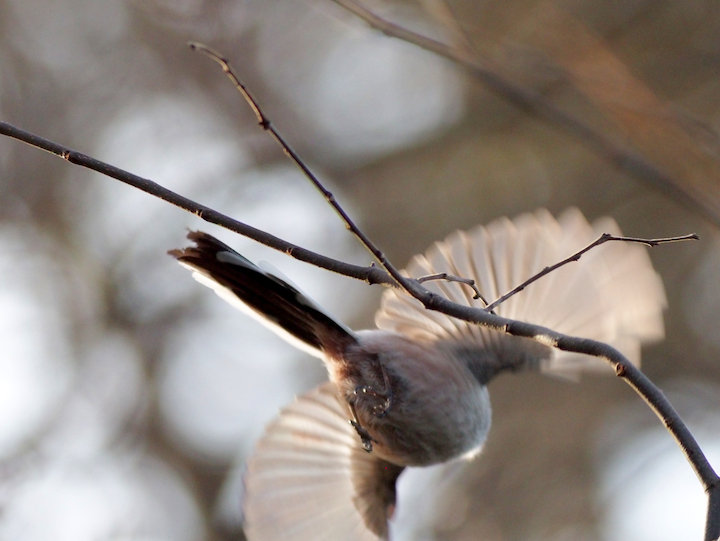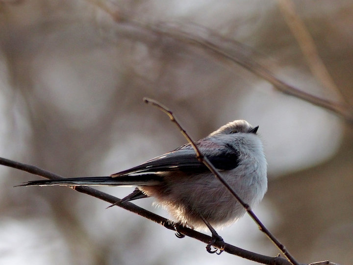 そうしたら、いきなりエナガの群に遭遇。10羽以上いたかもしれません。ただ、彼らは立ち止まってはくれません。木々の枝をあちらこちらに飛び回っていて、マニュアルフォーカスでの撮影は難しい。結局まともに撮れた写真は、ほとんど無し・・・うーむ、まだまだ修行が足らん。