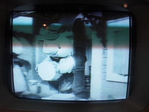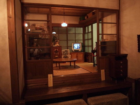 当時そのままに、照明は電球のみですし、御成婚の写真がさりげに飾ってあります(私の実家にもありました)。それに、当時のテレビ受像機には当時の番組が映し出されています。しかも、番組を切り替えるときには「しばらくお待ちください」の画面を表示する念の入れよう(笑)。ちょっと感動してしまいました。