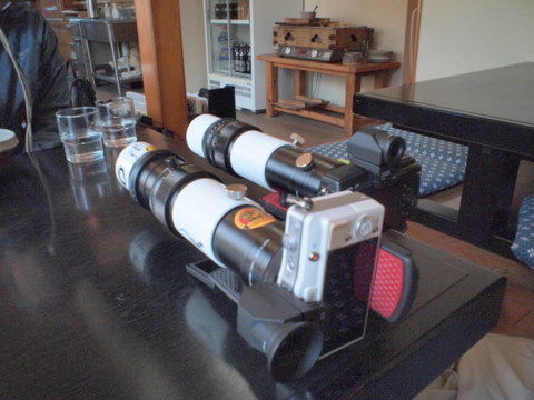 おっ、なんとデジボーグが2台です。実は、roadrunnerさんは45mmのアポクロマートレンズ(45ED)を取り付けたデジボーグをお持ちです。つまり私のと一緒。ガンマンスタイルで持ち運んでいるのも、私と同じです(ガンマンスタイルの写真も撮ったのですが、なんとピンボケでした、苦笑)