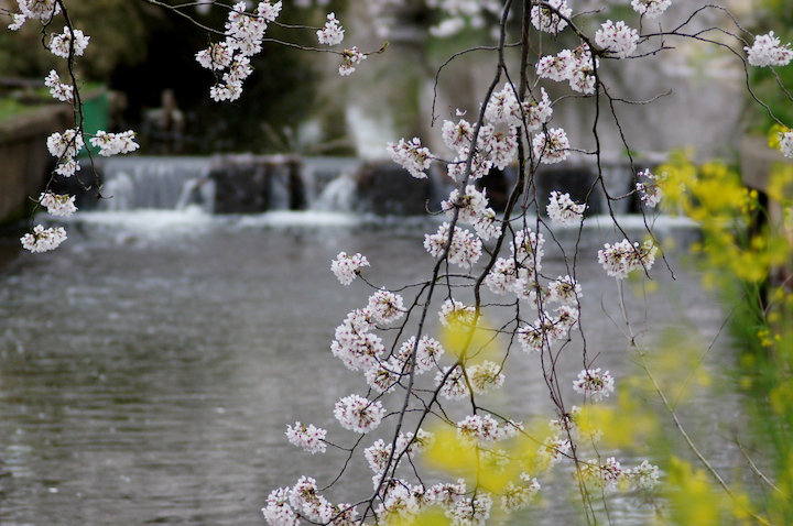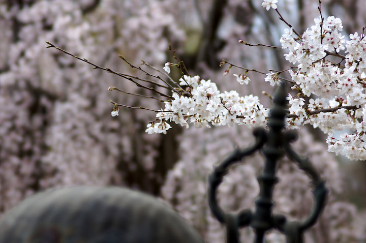この3枚はSTFレンズで撮りました。ピントを枝垂桜、ソメイヨシノの枝、弘法大師像に変えて写してみましたが、思いのほかどれも良い感じです。タイトルは「弘法大師像と花の滝」でいかがでしょうか(笑)