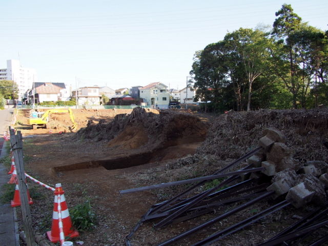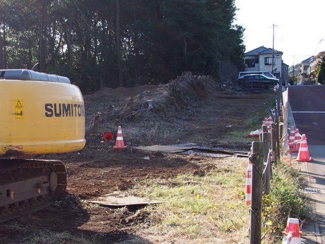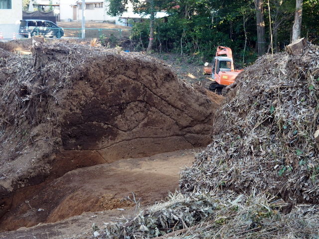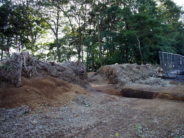 むき出しになった野馬土手は、奥の駐車場の金網の後ろに伸びていっています。この辺りはまだ木々が残っていますので、宅地造成はされないのでしょう。ということは、野馬土手もその部分は消滅を免れそうです。ただ立派な野馬土手ですから、できるだけ全体を残してもらえると嬉しいのですが。