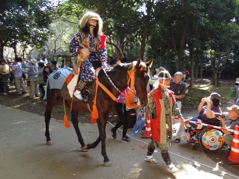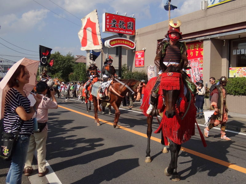 結論から言いますと、このイベントは見る価値が二重丸でした。騎馬隊は初富の捕込の横、貝柄山公園から鎌ケ谷の中心街へ向け行進するのですが、本当に勇壮でカッコイイ。女性の騎馬武者も2人。公園を出陣する時には、観客から自然と拍手が起きました。