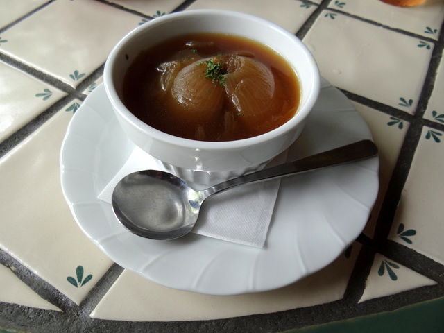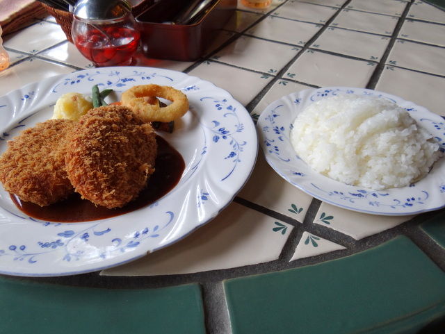 私はメンチカツのセットメニューを注文。これに冒頭に紹介したオニオンスープも付きます。メンチカツはナイフで切ると肉汁があふれ出てきて、なかなか美味しかったです。値段は1100円とロケーションの割には高めですが、何を言ってもオニオンスープのインパクトが大きく、納得の値段でした。