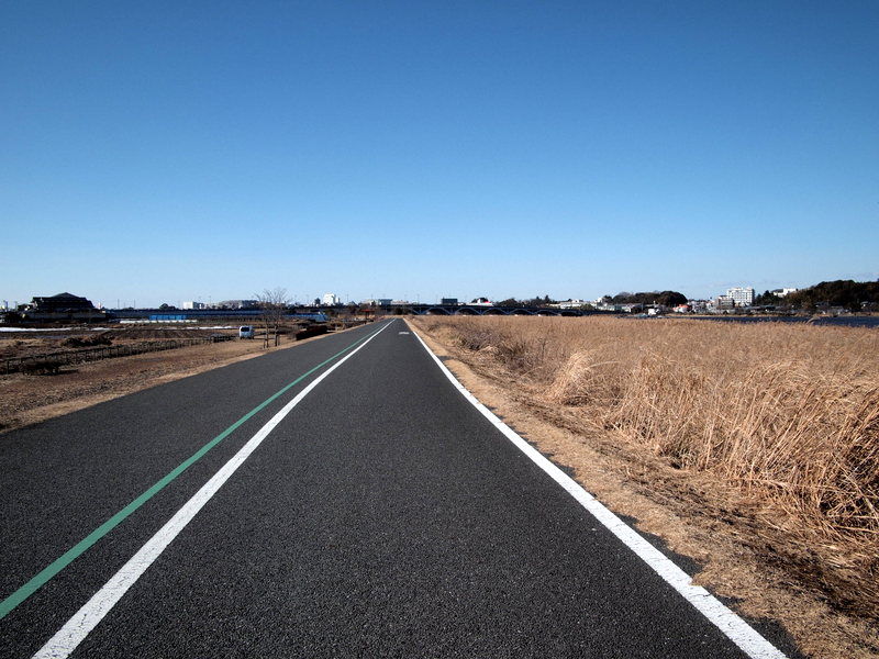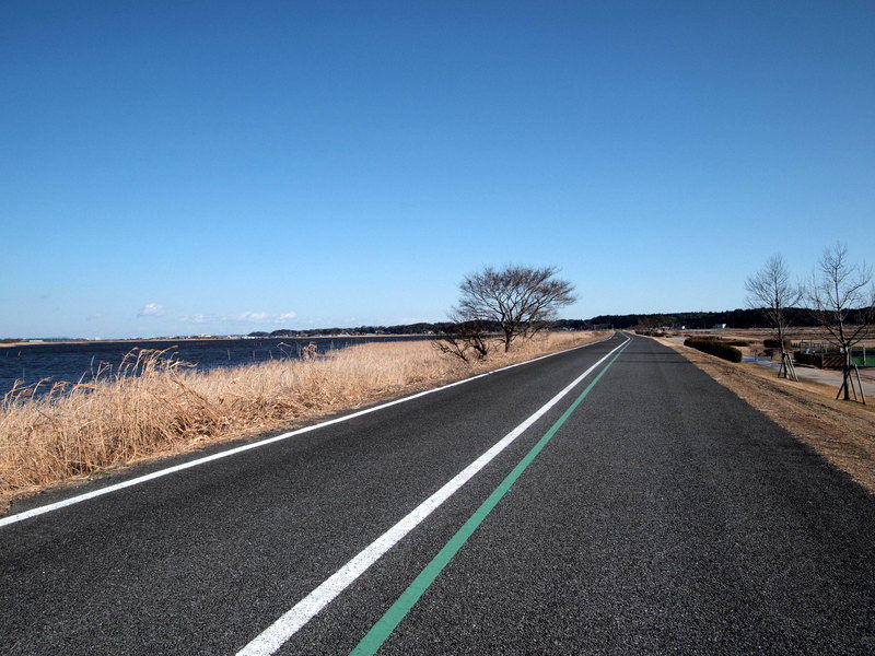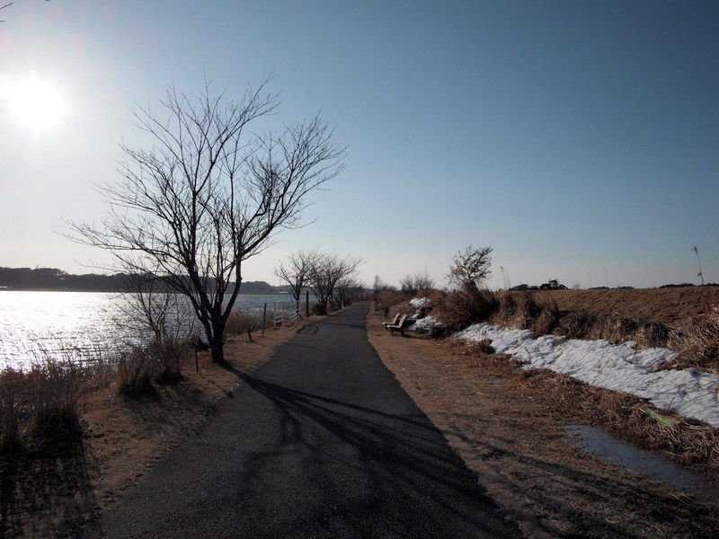 手賀沼南岸のサイクリングロードですが、見事なくらい自転車や人がいない(驚)。実はこの日、自転車で走りに行こうかとも思ったのですが、積雪の残りが心配で断念・・・というのはウソで、風が強いのでめげてしまいました(苦笑)。