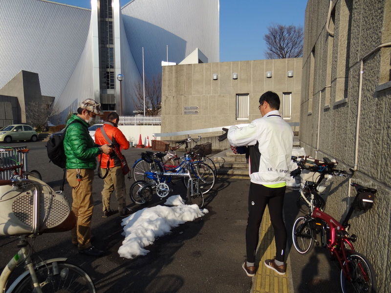 ご一緒したのは、はんぞうさんのえいじさん。私も含め恒例の小径車四人組です。実は、このポタは先の2週にわたる週末の大雪で、2回延期になっていました。今回、好天に恵まれ(寒かったですけど、苦笑)、ようやく実現にこぎ着けました。いつものように江戸川の樋野口に集合して、都内に向けて走り出しました。