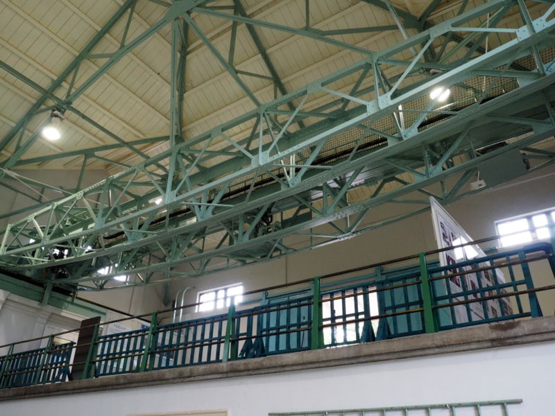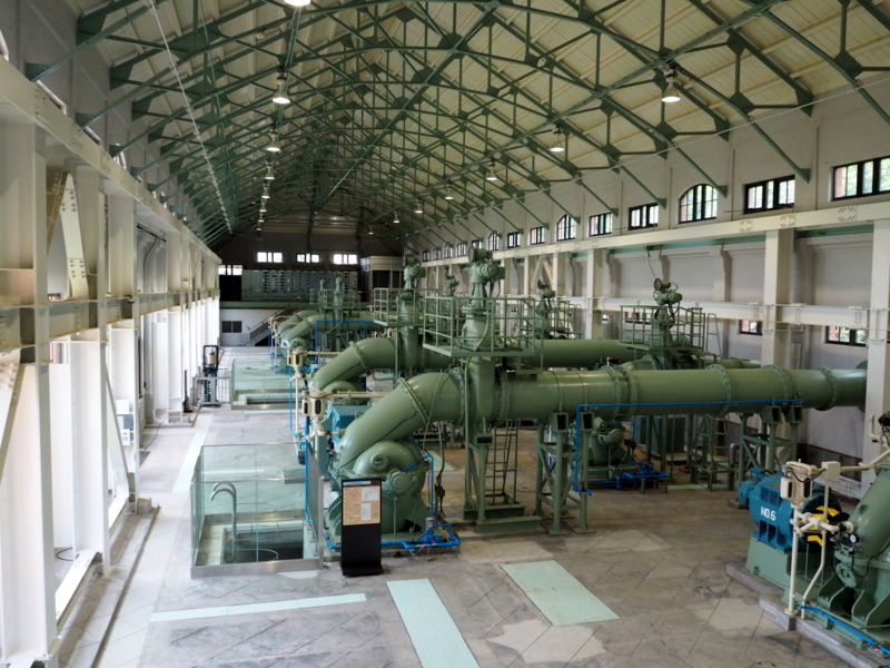 内部の屋根を支える鉄骨は大正11年当時のまま。設置されている装置は平成11年の閉鎖の時まで動いていたポンプとのこと。手動で動かしていたクレーンも圧巻でした。
