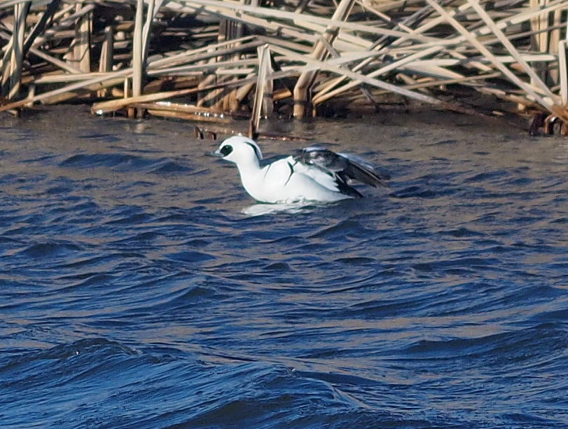 そして、最後が手賀川にいたミコアイサ。「パンダガモ」との愛称があるらしいのですが、まさにパンダですね。ワンチャンから随分前に教えていただいていたのですが、なかなか発見できませんでした。強風の中、ようやく出会えました。
