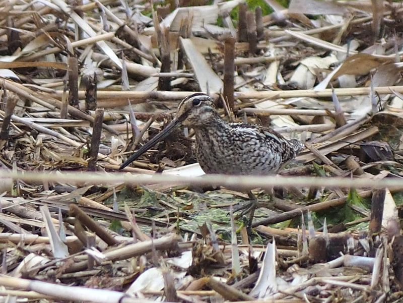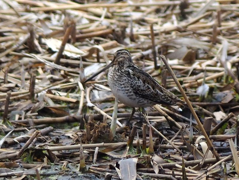 実はタシギは、1月の利根運河の野鳥観察会の際にもいました。ところが、「あそこにタシギがいます」と教えてもらっても、どこにいるのか分からず。あまりの保護色に、私の目では確認できませんでした(苦笑)。で、今回ようやくのご対面。こいつも冬鳥ですので、ラストチャンスでした(喜)