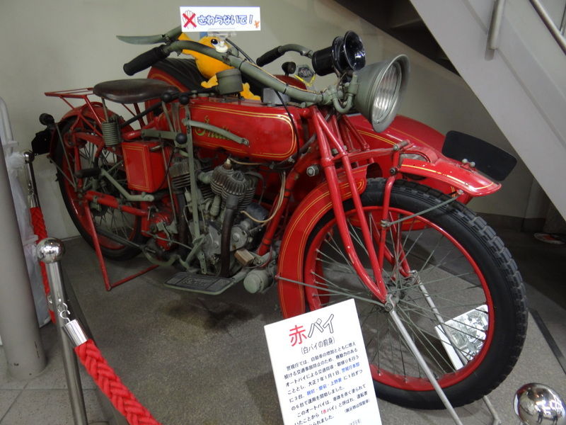 1階には、こうしたサイドカー付の白バイ、黒バイ、赤バイも展示されていました。特に年代モノの赤バイは、メカ好きな人には堪えられないと思います。