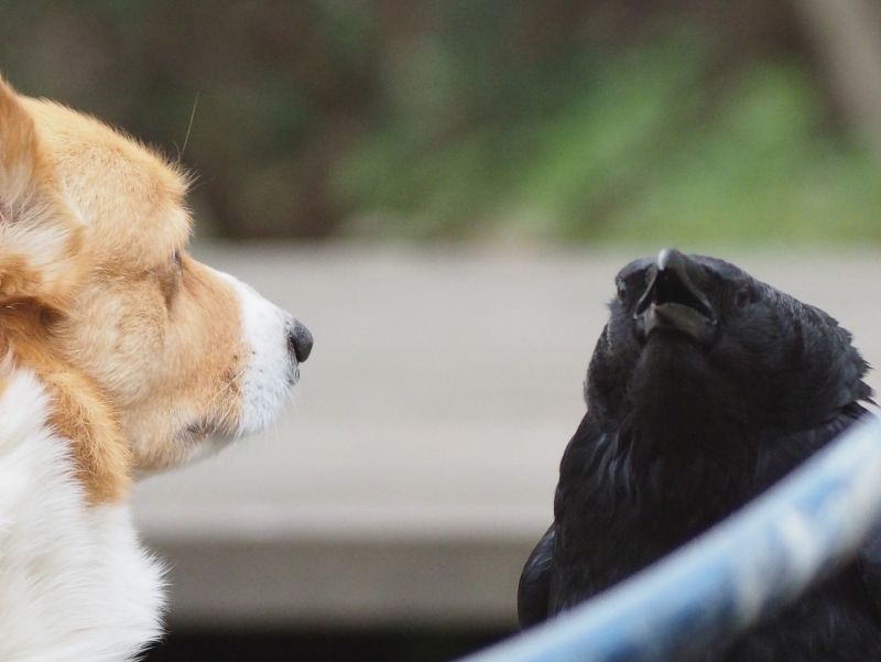 呑ちゃんによると、水元公園では有名な存在で、コーギー犬が「モカ」、ハシボソガラスが「ガー幸」というそうです。しかも飼い主のオジサンは、彼らを題材にブログもお書きになっているとのことです。